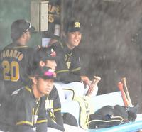 2回目の中断に苦笑いでベンチに戻る阪神・藤浪晋太郎(中央)=北谷(撮影・棚橋慶太)