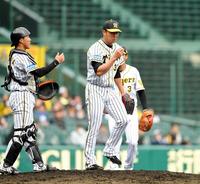 3回の攻撃を終え、選手交代を告げる阪神・金本知憲監督
