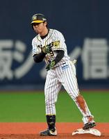 3回阪神1死三塁、阪神・高山俊が右翼線に同点二塁打を放つ(投手 中日・笠原祥太郎、捕手 中日・大野奨太)=京セラドーム(撮影・山口登)