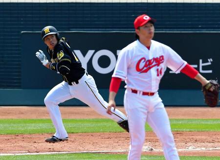 この回の先頭打者。広島・大瀬良の初球、真ん中付近へ甘く入った直球を捉えた。快音を響かせた打球はグンと飛距離を伸ばし、左翼席へ着弾。「能見さんが粘り強く投げてくれているので。先制点を取ることができてよかったです」と納得の表情。