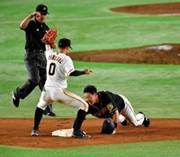 7回阪神無死一、二塁、けん制でアウトになる阪神・大山悠輔(右)=東京ドーム(撮影・出月俊成)