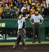 6回、阪神・陽川尚将は左越えに一度は本塁打と判定された適時三塁打を放つ