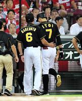 5回、適時打を放つも負傷し、ベンチに下がる阪神・糸井嘉男(中央)=マツダスタジアム(撮影・高部洋祐)