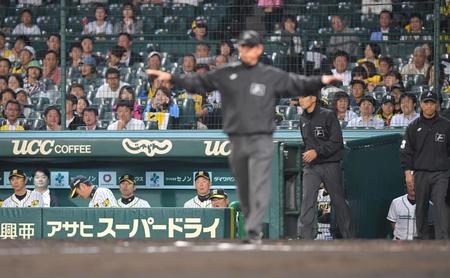 捕手の梅野が捕球し、三塁へ懸命の送球も判定はセーフ。金本監督はリクエストを要求したが、判定は覆らなかった。