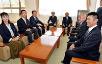 阪神の佐野仙好統括スカウトから挨拶を受ける阪神2巡目の小幡竜平=延岡学園高等学校(撮影・持木克友)