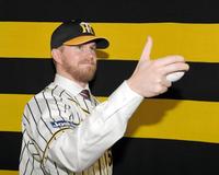 笑顔でポーズを決める阪神 ピアース・ジョンソン=阪神球団事務所(撮影・田中太一)