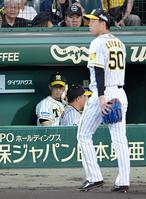 4回表1死1塁、打者・アドゥワの時、降板する阪神・青柳(撮影・坂部計介)