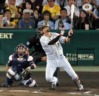 7回、中越えへソロを放つ阪神・大山悠輔=甲子園(撮影・田中太一)