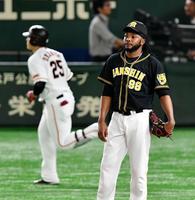 5回巨人無死一塁、巨人・岡本和真(右)に同点2ランを浴びた阪神 ラファエル・ドリス=東京ドーム(撮影・中田匡峻)