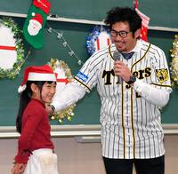 大阪くるみの会のクリスマス会に参加し、集合写真に納まる岩田(中央)