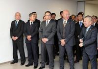 仕事納めに臨む(左から)谷本球団本部長、揚塩球団社長ら