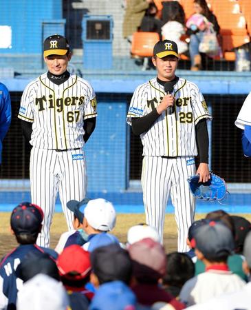 阪神の岩崎優投手(28)と高橋遥人投手(24)が29日、静岡県内の草薙総合運動場で行われた、プロ野球静岡県人会主催の野球教室に参加した。