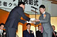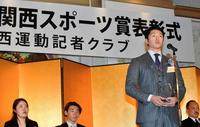 関学大・鳥内前監督(右)と言葉を交わす近本