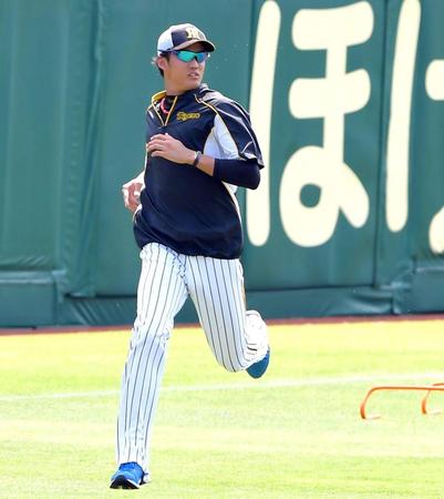 午後1時35分、グラウンドに一番乗りで登場。入念にストレッチした後、秋山とキャッチボール、ポール間走で汗を流した。福原投手コーチや梅野とも言葉を交わす場面もあった。