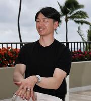ダイヤモンドヘッドを背にポーズを決める坂本(左)と近本(撮影・田中太一)