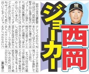 阪神の金本知憲監督(49)は19日、西岡剛内野手(33)を選手起用の“ジョーカー”に指名した。福留の休養日など、チームに生じた穴にはめこんでいく考えだ。