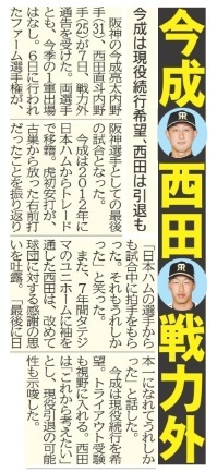 阪神の今成亮太内野手(31)、西田直斗内野手(25)が7日、戦力外通告を受けた。両選手とも、今季の1軍出場はなし。6日に行われたファーム選手権が、阪神選手としての最後の試合となった。