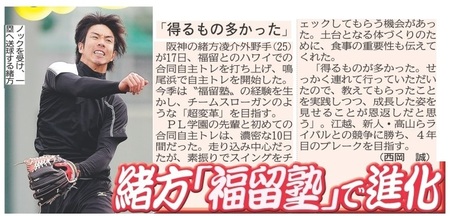 阪神の緒方凌介外野手(25)が17日、福留とのハワイでの合同自主トレを打ち上げ、鳴尾浜で自主トレを開始した。今季は〝福留塾〟の経験を生かし、チームスローガンのような「超変革」を目指す。