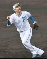 新庄監督(左)とタッチを交わす坂本(撮影・西岡正)